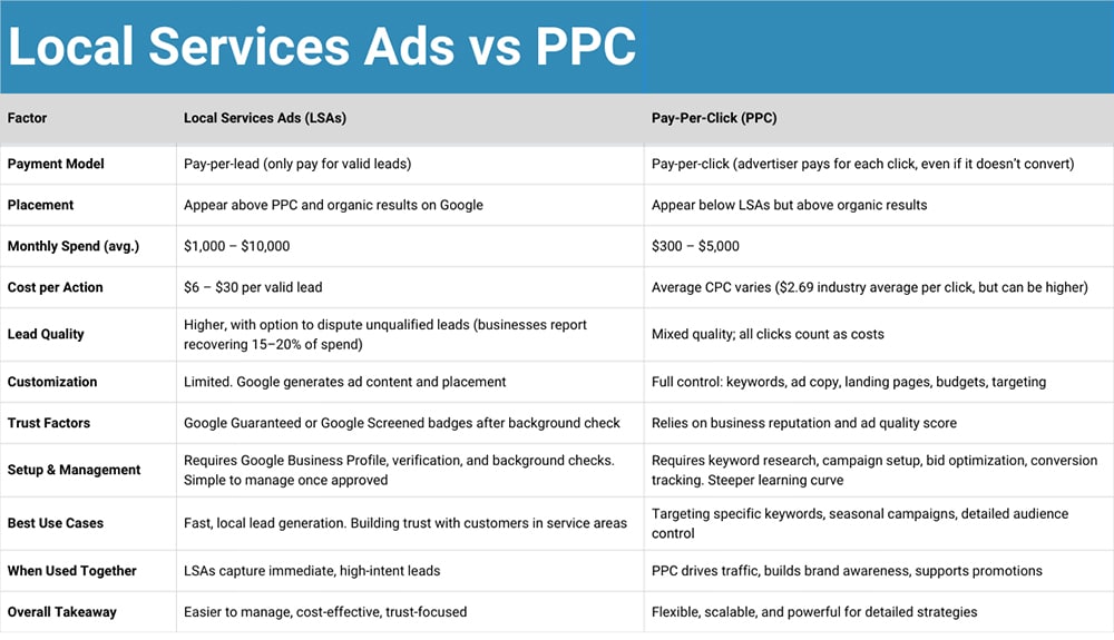 PPC gives you control over targeting and messaging, while LSAs provide high visibility and trust signals at the top of Google search results.